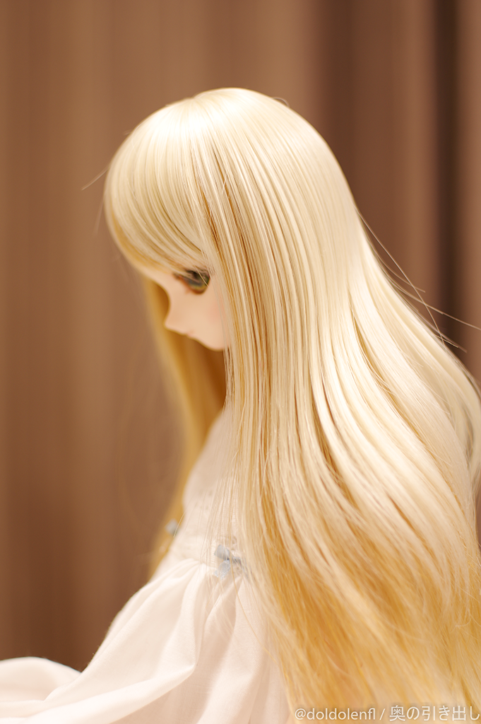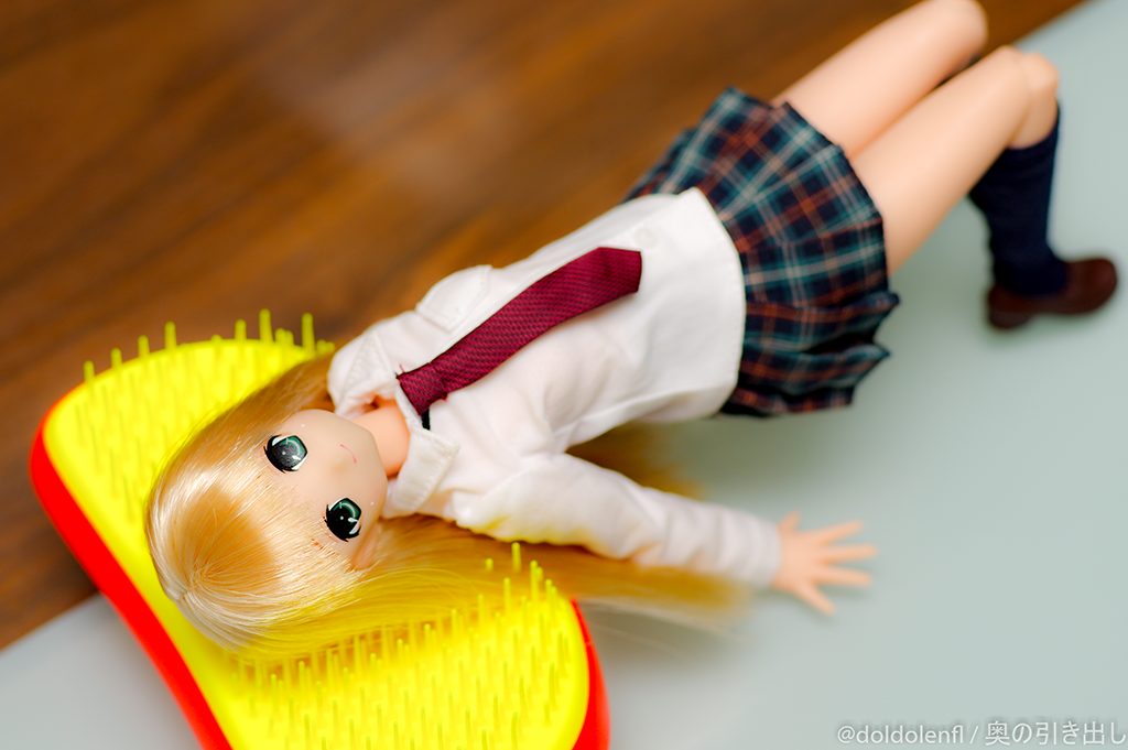 このウィッグは毛先がカールしていて、普通の櫛で梳かそうとすると引っかかるし、無理に梳くとすると毛が抜けたり、摩擦熱で縮れてしまったりします。タングルティーザーでも最初のうちは引っかかりました。しかし毛先から丁寧に梳かしていくと、いつのまにかスッと櫛が通るようになります。水もオイルミストも付けずにこの仕上がりは、ちょっと凄いと思います。
