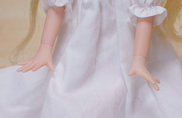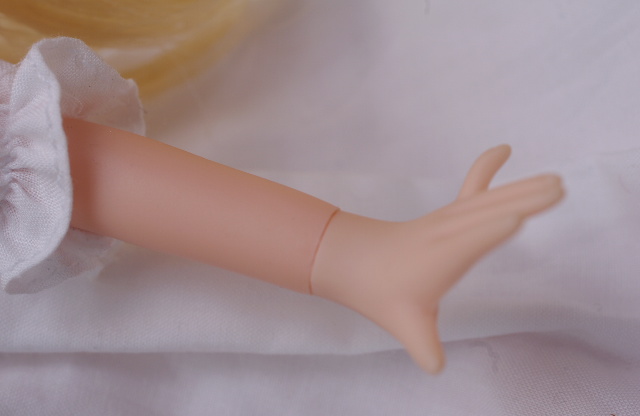 パーツを換えなければ問題ないのですが、フル可動ボディの入荷があったと言う事で、思い切って換装することにしました。その前に、どれほどの色の差なのか、写真に撮ってしまいましょう。サアラさんの左手(向かって右)だけOPパーツの手首と差し替えてみました。
