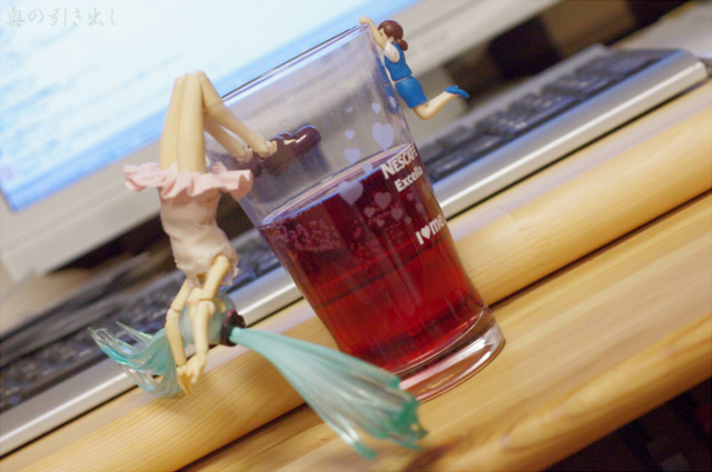 以前もどこかで見かけた、でも買わなかった『コップのフチ子』。今回は2ndの名の通り新シリーズのようです。さっそく開封して、コップのフチにかけてみました。…おー、コップの厚さやサイズを選ぶけど、ちゃんとぶら下がる。ぶら下がる方は可愛いなあ。ふんぞり返っている方はワイルドだなあ、はは、パンチラしてるけど全然嬉しくないや。