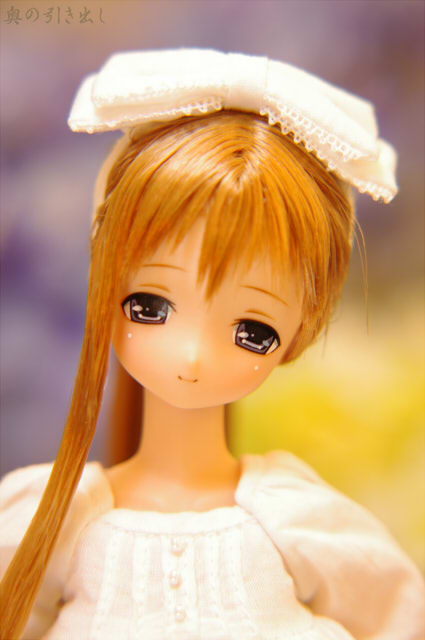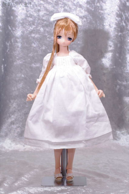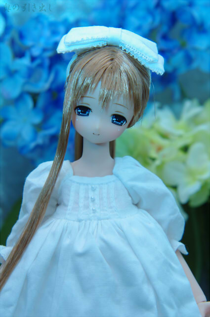 髪色のせいかキャラのせいか、みあさんには色が濃い衣装を着せることが多いです。ちょっとオトナっぽくという意識は毎回ありましたが、何しろ黒が多いので、たまには淡色で可愛らしいものを着て頂こう!と思い立ってお着替えしていただきました。このところお色気路線だったり猫だったりとイロモノばかりだったしね…。