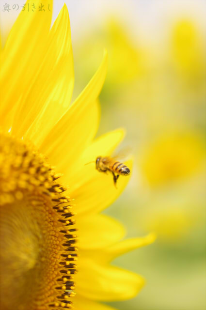 電車を乗り継いで1時間もすると、同じ県内とは思えない風景が広がっています。田んぼの向こう側に黄色い地平線が見えてきたら、そこがひまわり畑。55万本のひまわりが、時期をずらして咲くように植えられています。