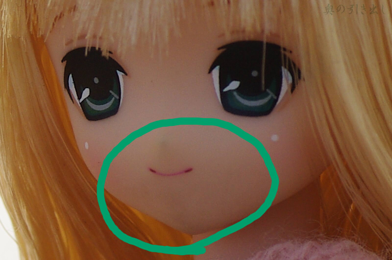 海辺の写真の等倍切り抜きです。見づらいと思いますが、緑で囲んだ部分、鼻から口にかけて黒っぽくなっています。これは落ちるかどうか分かりませんが、レッツチャレンジ。