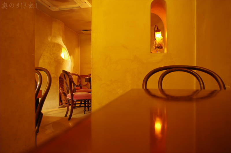 店内はオープンなカウンター席と、壁に仕切られてプライベート感あるテーブル席。カウンターはおしゃれな感じですが、テーブル席はカーペットがボロボロ、白壁には色が染みつき、薄暗いくらいの明るさで白熱灯が照らしています。お世辞にも綺麗とは言えませんが、長い時間を感じるような、つい入ってみたくなる空間です。