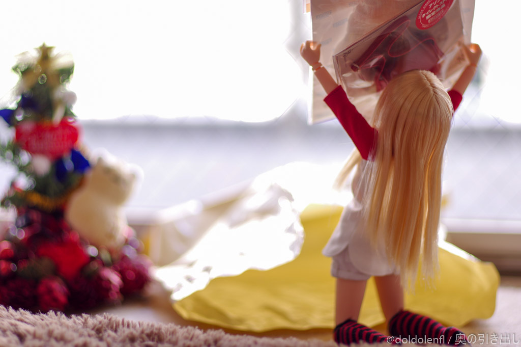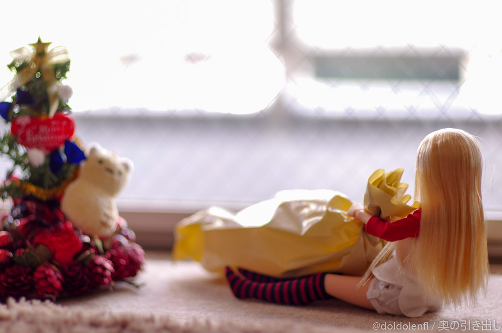 ちょうどアゾンの新作が入荷した頃でした。どれもとても可愛くて大変迷いましたが、せっかくだからクリスマスカラーに合わせた物にしようということで、ニットワンピセットと赤いバッグにしました。冬じゃなかったらこもれびシリーズを買っていたかも。