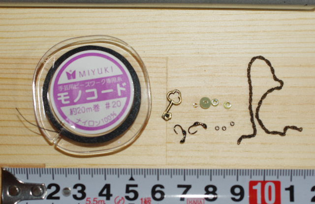 古びた色をした鍵束のアクセサリがあったので、分解して1つだけ取り出しました。マヤさんの瞳が緑色なので、アベンチュリンのビーズを装飾に。鉱物としては安物ですが、主張しすぎない色が良いのです。直径は4mmを選びました。1/6サイズにはこのくらいで良さそうです。色が濃ければ3mmでも十分目立つと思います。
