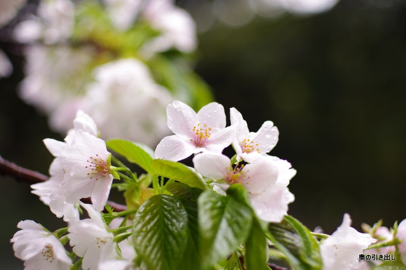 はい、その2でございます。これはオオシマザクラ。花が残ったまま鮮やかな緑の葉が出てきて綺麗です。しかし、濡れているという事は…。